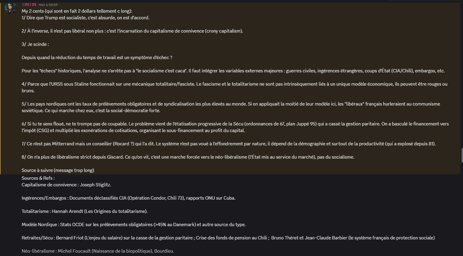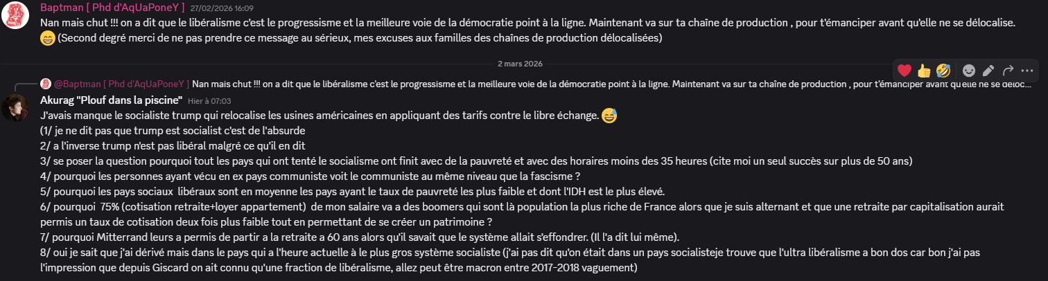 J’avais un échange avec @Tintin dans la taverne sur discord, qui m’avais repris après un de mes messages qui était je l’avoue, un message de taverne digne de la discussion des plus grand PMU de france et navarre, (et je t’en remercie d’avoir élevé le niveau car c’est une discussion qui sur le fond est vraiment pertinent a avoir et que malgré ce qu’on peut dire socialisme et libéralisme sont issus tout les deux de l’humanisme et que si dans le constat et la proposition les visions diffère, les aspiration sont assez proche (oui, je sait ça se voit que je suis a equinoxe maintenant